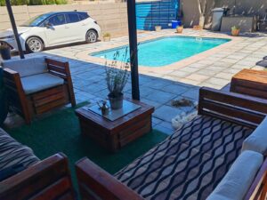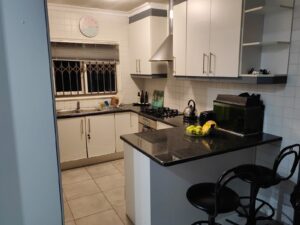 The kitchen is fitted with granite counter tops, built-in cupboards, double sink, under counter oven, hob and extractor fan.